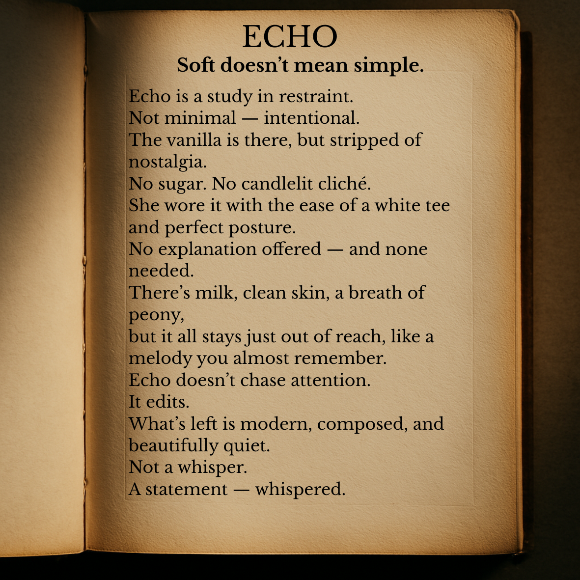 Spray once, maybe twice. Echo doesn’t ask for attention — it owns it. Apply to pulse points or the hem of something soft. Best worn with clean lines, clear thoughts, and just enough mystery.